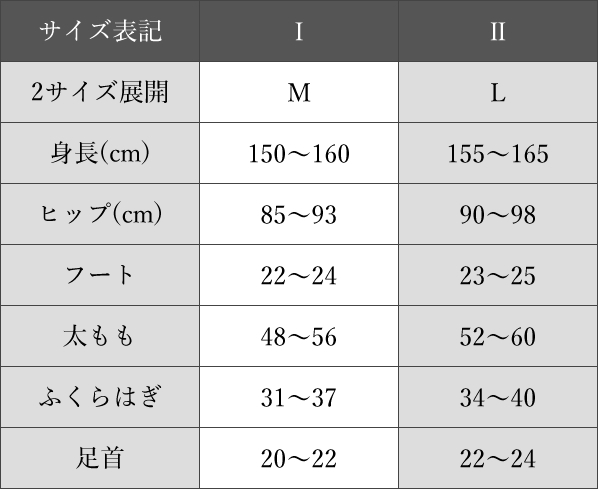 足のむくみ・疲れ改善等の効果には個人差がございます。また伝線につきましても、一般的なストッキングに比べて、破れにくく伝線しにくい構造になっておりますが、使用状況などにより、必ずしも破れないことを保証するものではございませんので、ご了承くださいませ。