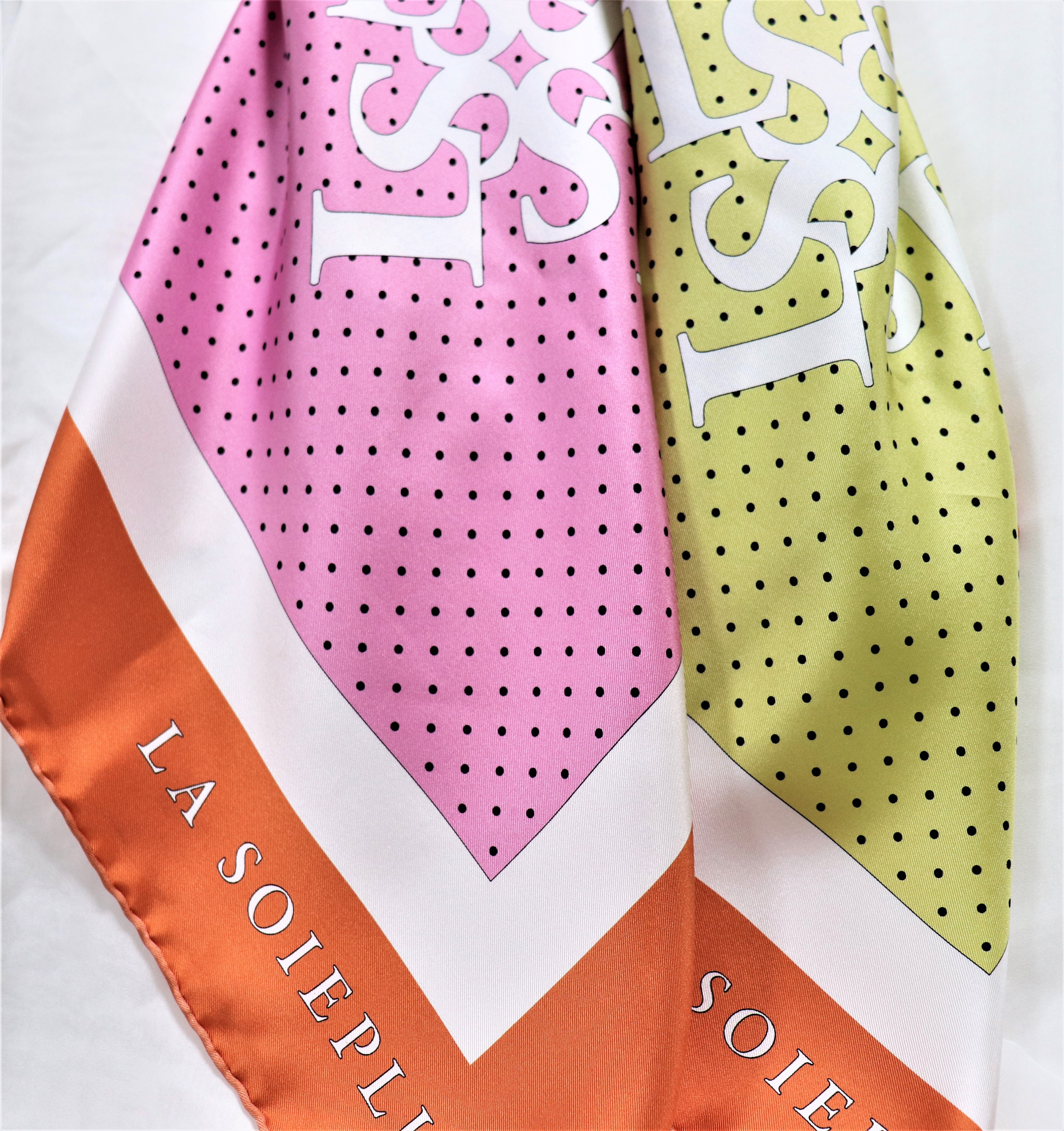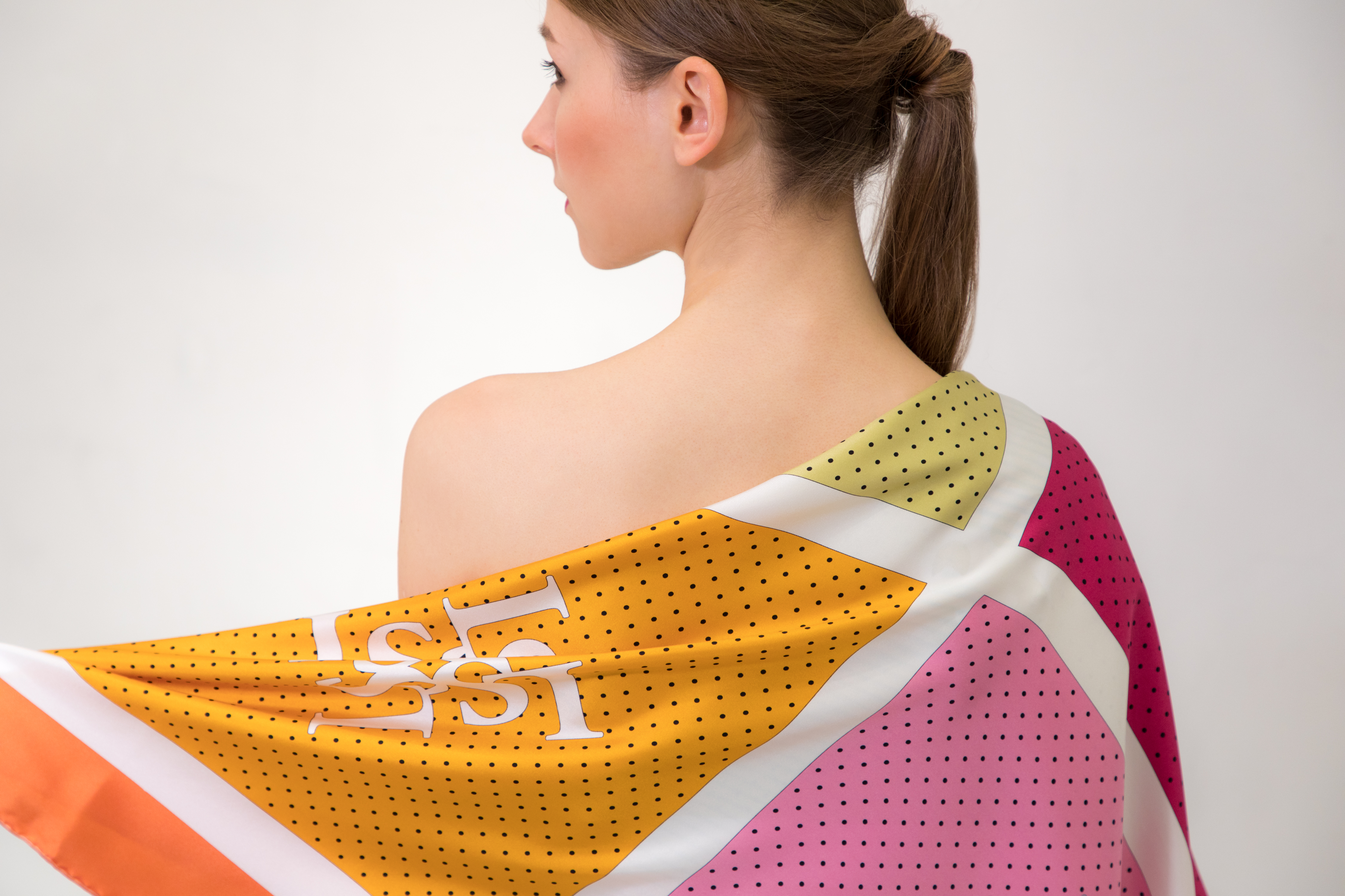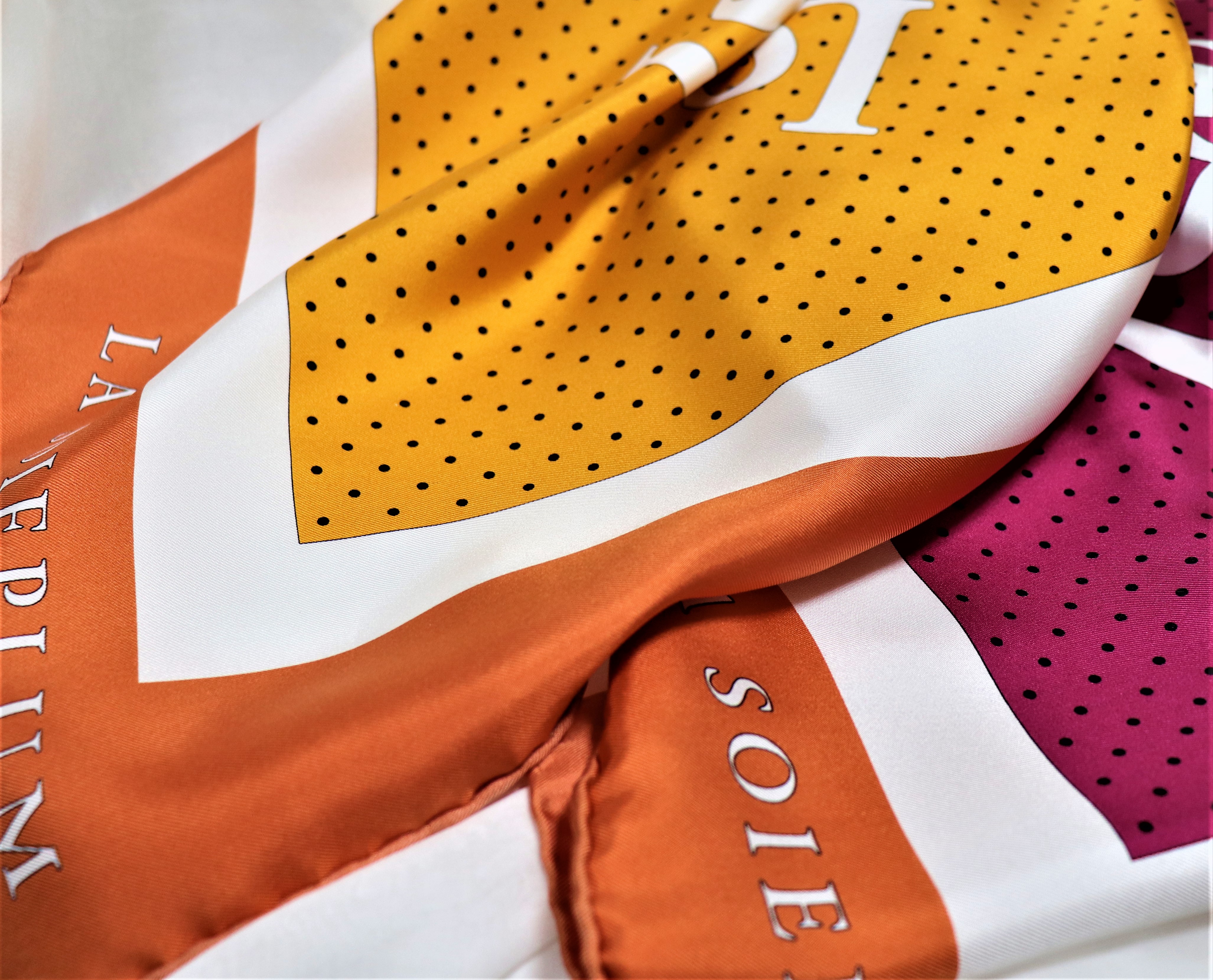 最高級のシルク素材に、手捺染(ハンドスクリーン印刷)、ふち縫いは手縫いによるルロタージュ、全ての工程を日本の職人によって仕上げています。