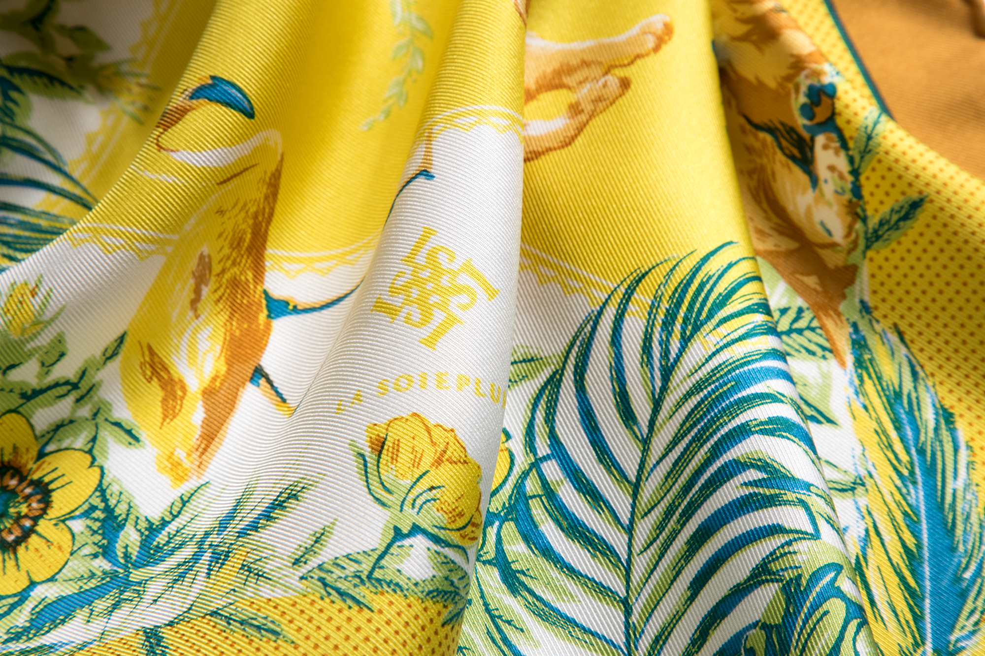 最高級のシルク素材に、手捺染(ハンドスクリーン印刷)、ふち縫いは手縫いによるルロタージュ、全ての工程を日本の職人によって仕上げています。